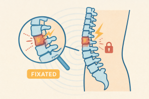フィクセーションとは、個々の椎骨の機能の低下、特に関節可動域の減少(Hypomobility)を指すカイロプラクティックの専門用語です。この概念は簡単に言うと「骨の歪み」と説明しますが、どちらかというと骨の静的な位置異常よりも動的な運動分節の動きの制限です。
